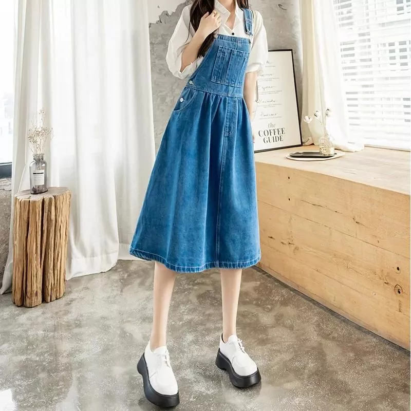 Korean Fashion Denim Patchwork Dress – Knee-Length Streetwear