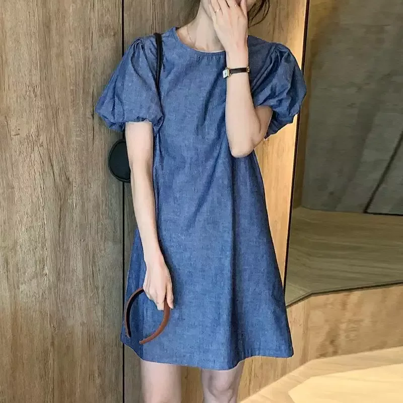 Chic Puff Sleeve A-Line Denim Mini Dress – Casual Pleated Summer Sundress