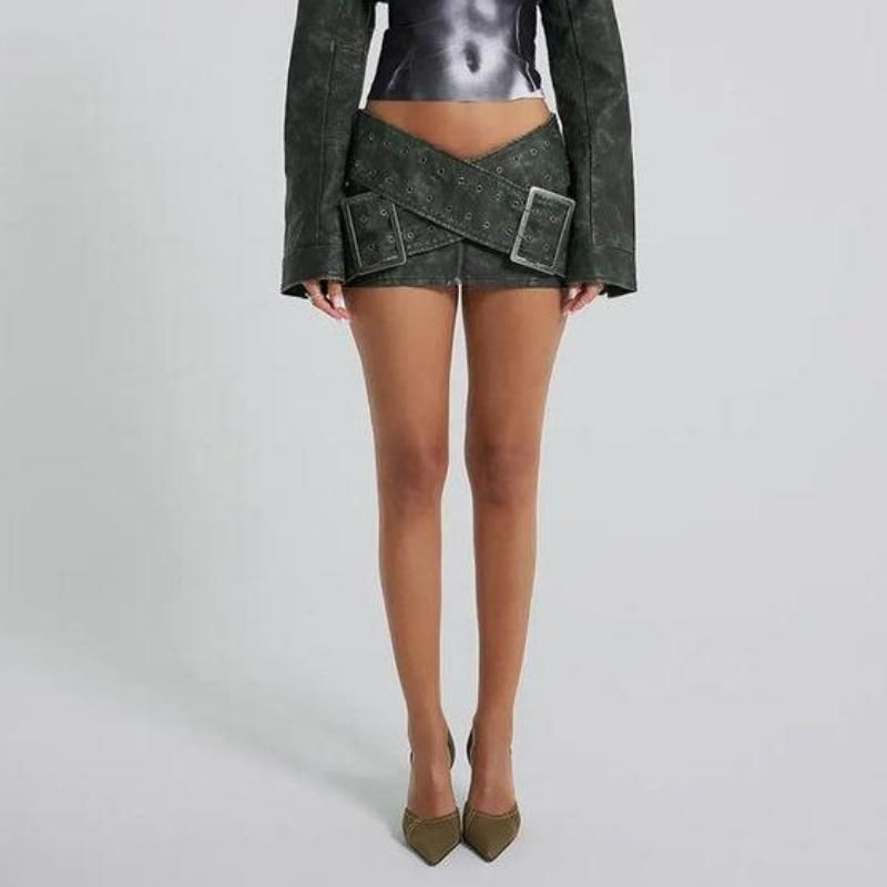 Cyberpunk Y2K Faux Leather Wrap-Around Micro Mini Skirt with Belt